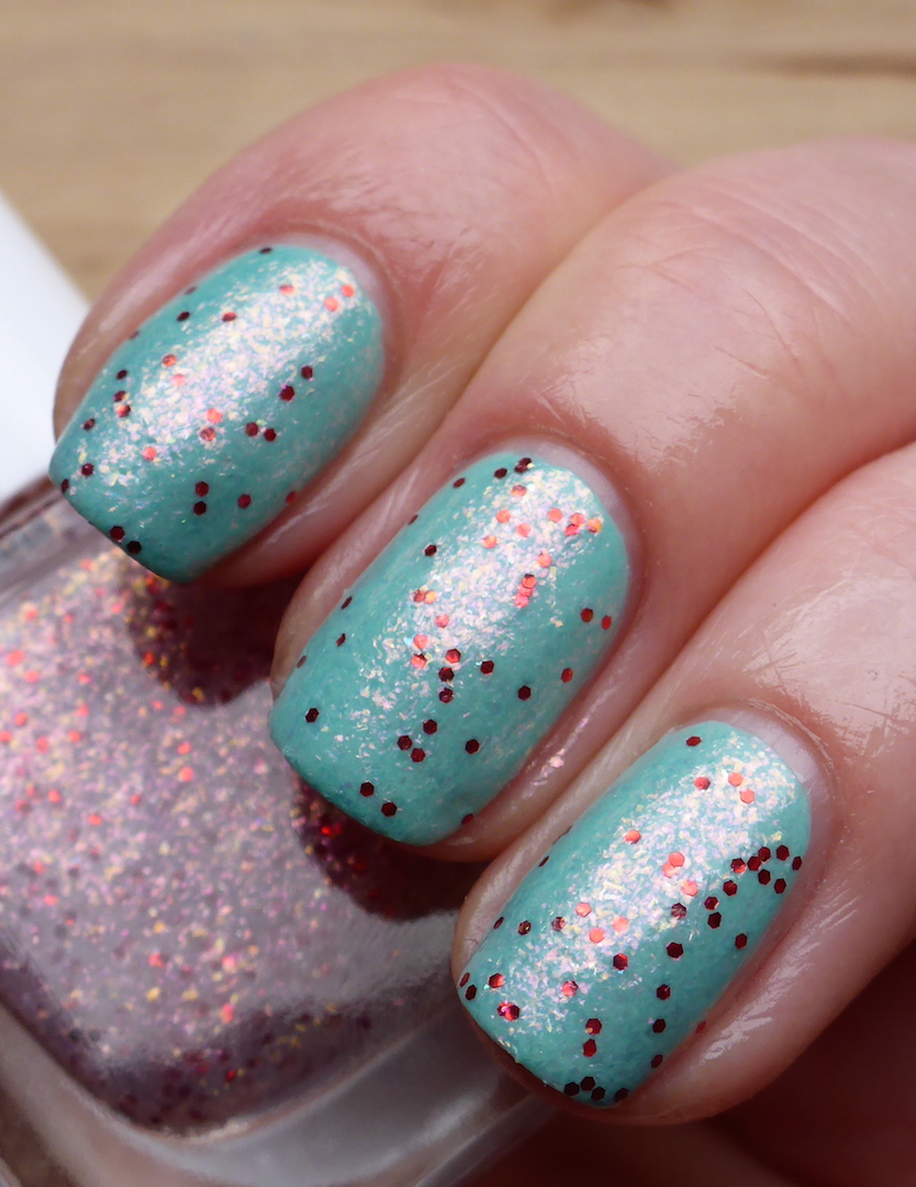 Die Kombination dieses Mintlackes mit dem Schimmer und dem roten Glitzer (das zwischendurch schon irgendwie Pink wirkt) finde ich einfach genial. Im Fläschchen sieht der Topper zwar viel Rosaner aus, aber ich denke, das wird ein Stück weit vom Mint geschluckt. ;)